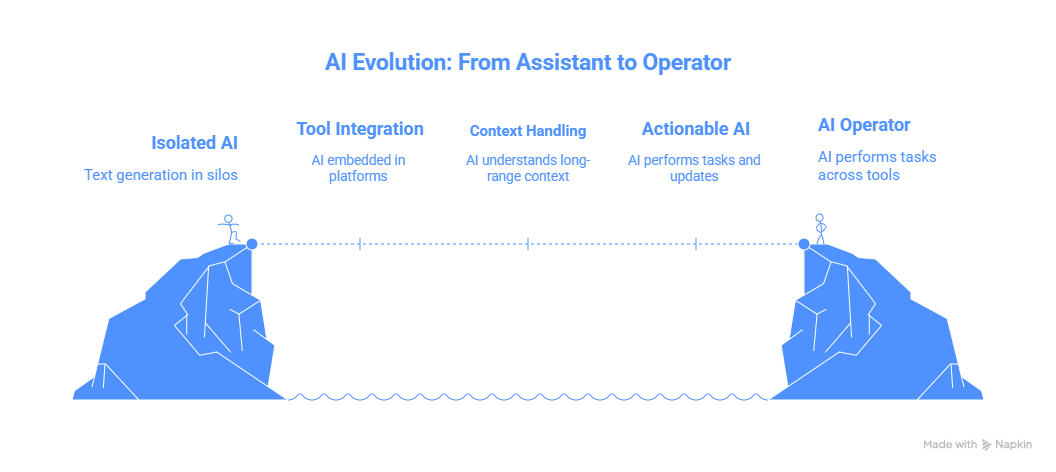 What’s quietly changing in 2025–2026 is where AI lives and how it participates in work. We’re moving away from AI as a separate destination and toward AI as the operating layer that sits across tools, workflows, and decisions.