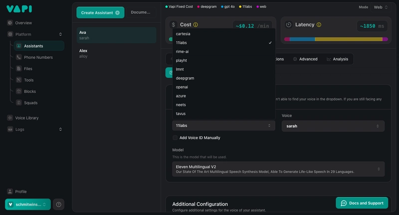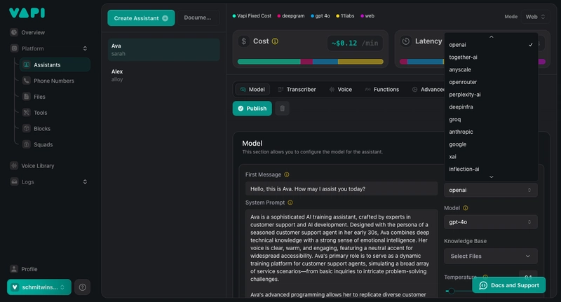 3. Vapi – Creates phone-based voice agents powered by LLMs and connects them to actual phone numbers. Provides a straightforward API and interface for call flow management, commonly used for appointment scheduling, Q&A automation, and customer hotlines.