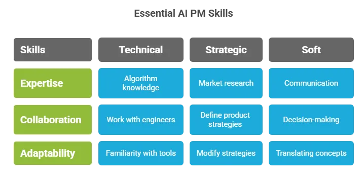 In addition to technical knowledge, strategic abilities are crucial for AI Product Managers. These abilities encompass performing market analysis, establishing product strategies, and creating adaptable product roadmaps.